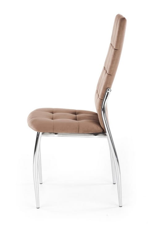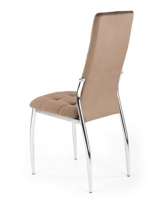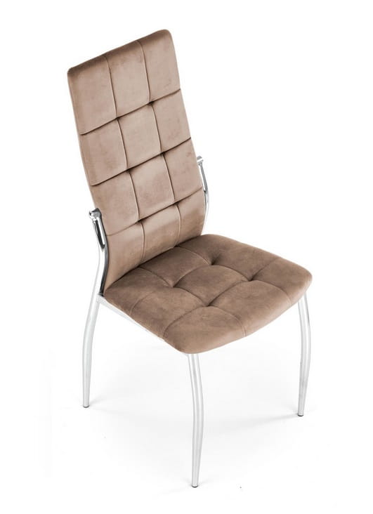 A wyróżnia się on niebanalną, designerską konstrukcją wykonaną ze stali chromowanej, pięknie zaprojektowanym siedziskiem z oparciem, ozdobionymi dekoracyjnymi, geometrycznymi pikowaniami. Na Państwa uwagę zasługuje również piękna kolorystyka. Ciepły odcień beżu jest niezwykle elegancki! Szczególnie, gdy subtelnie rozświetla ją srebrny blask metalowego stelaża. Wspaniały kontrast! Krzesło tapicerowane jest niezwykle ładną, przyjemną w dotyku, miękką tkaniną velvet. Te wszystkie cechy, skupione w jednym krześle - wywołują efekt wow!