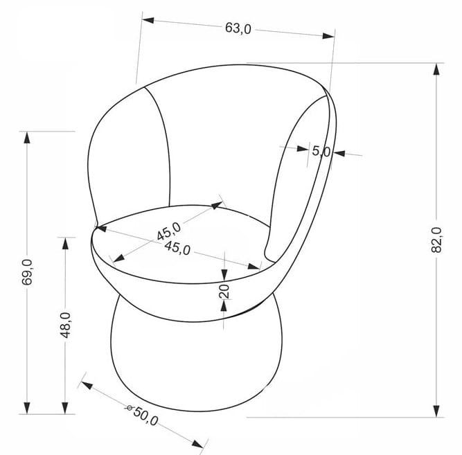 - Wymiary: szerokość - 63 cm, głębokość - 62 cm, wysokość - 82 cm, wysokość siedziska - 48 cm
