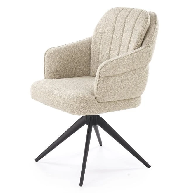 Beżowa tapicerka krzesła Molty to świadomy wybór, który wprowadza ciepło i naturalną elegancję do każdego wnętrza. Jej neutralny, piaskowy odcień przywołuje na myśl spokojne plaże i przytulne, słoneczne poranki. Przyjemna w dotyku tkanina zachęca do kontaktu, a jej uniwersalny kolor doskonale komponuje się zarówno z ciemniejszymi meblami, jak i jasnymi, nowoczesnymi aranżacjami. Charakterystyczny metalowy stelaż w formie czarnego krzyżaka, wykonany ze stali malowanej proszkowo, tworzy wyrazisty kontrast z jasną tapicerką, dodając całości designerskiego charakteru i stabilności, która przetrwa niejeden intensywny wieczór rodzinnych rywalizacji.