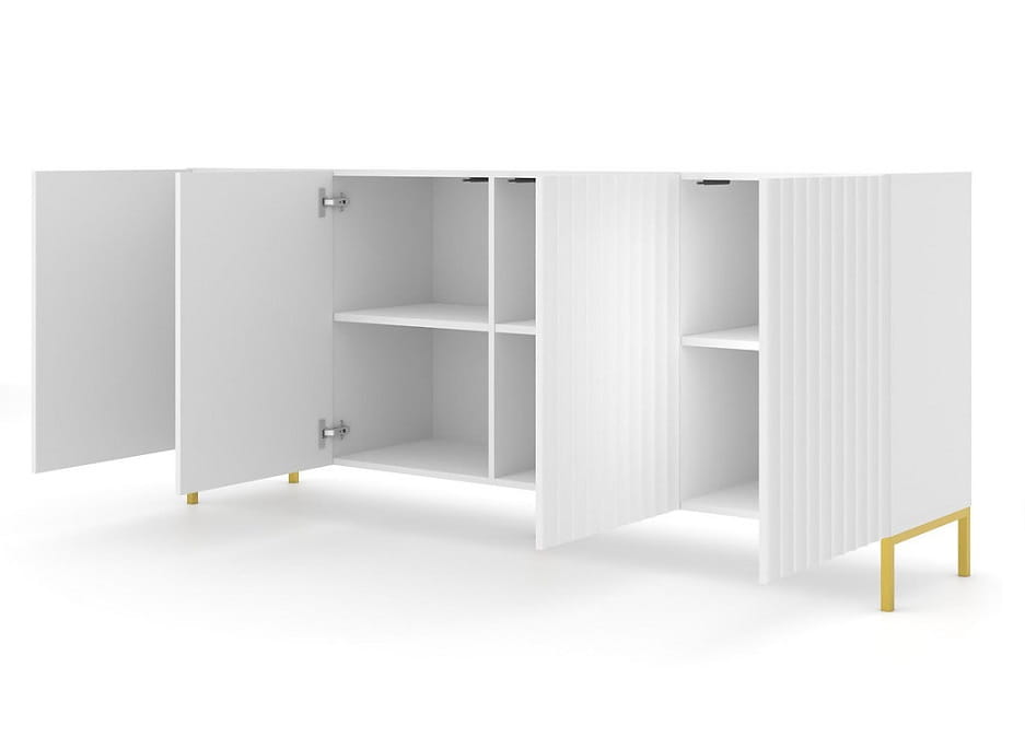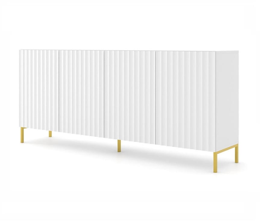Jeśli szukają Państwo mebla, który będzie estetycznym uzupełnieniem salonu, ale także zapewni miejsce do przechowywania to elegancka komoda z kolekcji Golden Waler jest idealnym wyborem. Jej frezowane fronty, klasyczna kolorystyka (matowa biel) i złote nóżki tworzą niepowtarzalne połączenie, które wzbogaci wygląd każdego stylowego wnętrza. Dodatkowo, system bezuchwytowy i funkcjonalne rozwiązania, takie jak zamykane szafki i półki wewnętrzne, sprawiają, że komoda jest praktycznym meblem w codziennym użytkowaniu. Polecamy.