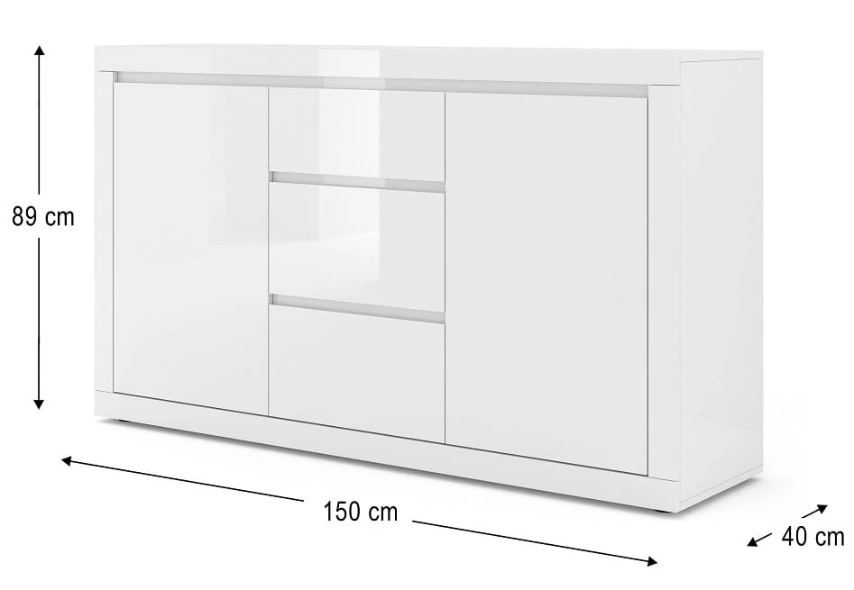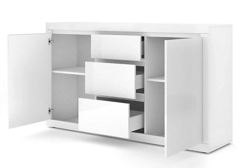 Choć komoda to mebel pełniący określone funkcje, w tym przypadku - służący przechowywaniu ubrań, to jednocześnie będzie on stanowić mocny punkt wystroju! Po pierwsze - za sprawą monumentalności. Regina Bianca to komoda, która jest dosyć spora. Ma ona aż 150 cm długości, jest też wysoka. Znajdują się tu dwie szafki z pólkami, wzbogacona jest ona również o segment trzech pojemnych szuflad. Po drugie - za sprawą designu. Prosty, minimalistyczny, a jednak nie pozbawiony uroku, jaki nadaje meblom biały połysk melaminy! Lakierowane fronty komody - błyszczą!
