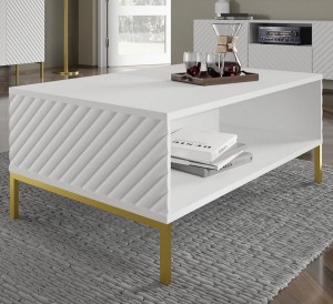 Stolik kawowy Glassy dostępny jest w kolorze białym, co pozwala na doskonałe dopasowanie do wystroju wnętrza w klasycznej kolorystyce. Ozdobą mebla są ponadczasowe złote nóżki, które nadają mu wyjątkowego charakteru. Dodatkowo, dolna półka pod praktycznym blatem ławy - pozwala na przechowywanie książek, czasopism oraz dekoracji.