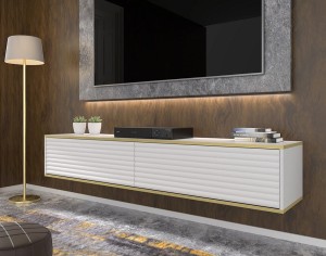 Szeroka oferta mebli RTV sprawia, że trudno znaleźć taki, który idealnie wpasuje się w nasze potrzeby i gust. Jednakże, nasza wisząca szafka RTV Classy w stylu glamour spełni Twoje oczekiwania. Biała szafka jest nie tylko nowoczesna i modna, ale także wykonana z wysokiej jakości MDF, co gwarantuje jej trwałość i solidność. Jej złote obramowanie nadaje eleganckiego wykończenia, które przyciąga uwagę gości.