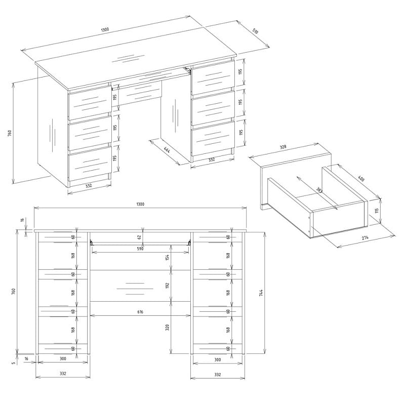 - Wymiary: wysokość - 146 cm (biurko: 76 cm + nadstawka: 70 cm), szerokość - 130 cm, głębokość - 51 cm, głębokość nadstawki - 18 cm