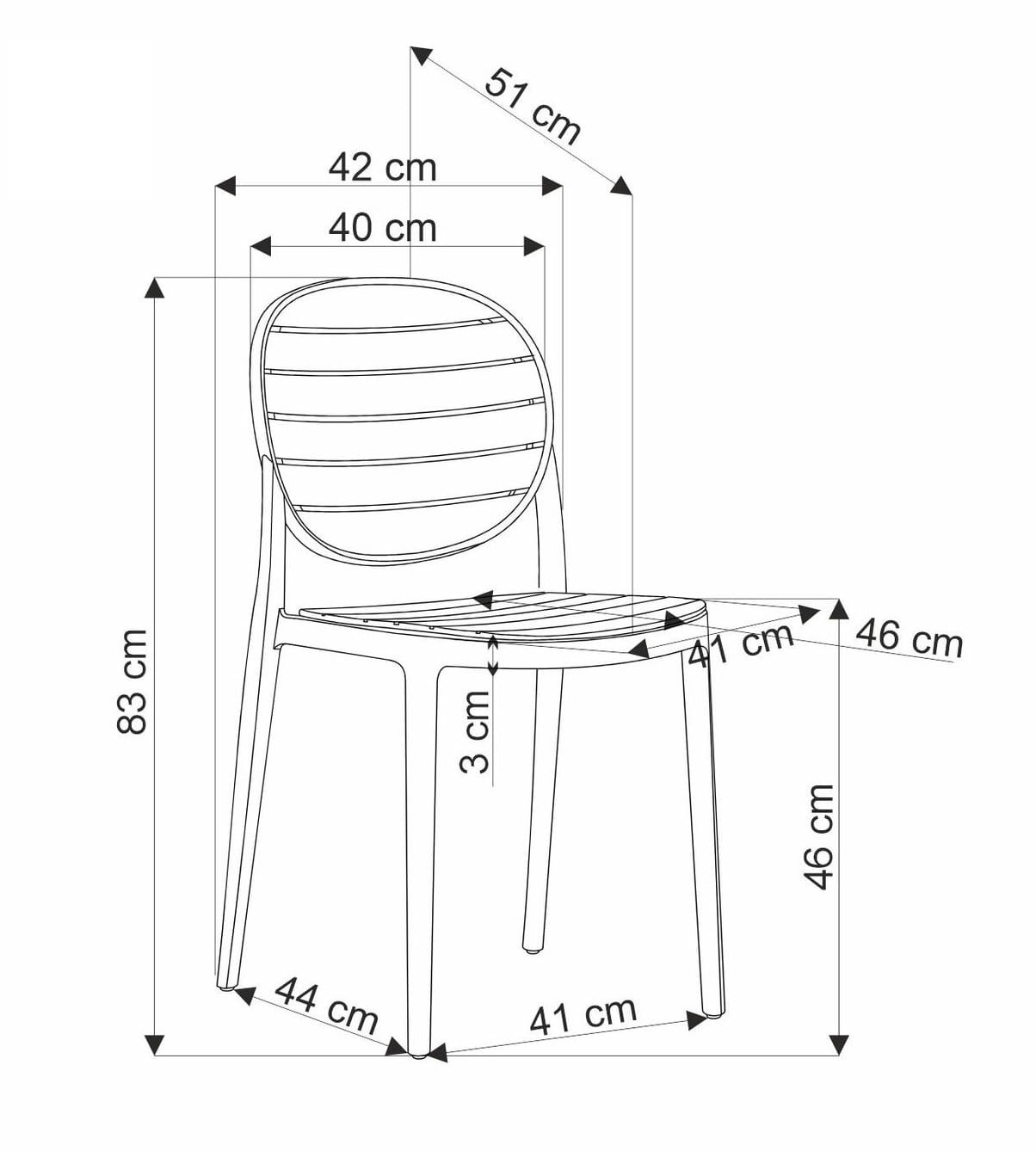 - Wymiary: szerokość - 42 cm, wysokość - 83 cm, wysokość siedziska - 46 cm, głębokość - 51 cm