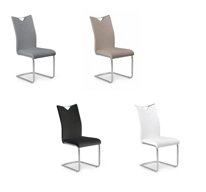 Pięknie zaprojektowane siedzisko, z subtelnymi, geometrycznymi przeszyciami na oparciu, a także jego pomysłowe wykończenie u szczytu sprawiają, że tapicerowane krzesło cechuje się także elegancką formą! Metalowy uchwyt w górnej części oparcia pozwala na łatwe przenoszenie czy też przesuwanie mebla. W dodatku krzesło pokryte jest oddychającą, łatwą w czyszczeniu ekoskórą w białym kolorze. Odcień ten sprawi, że pomieszczenie wyposażone w krzesła na płozach Haga będzie stylowo rozświetlone.