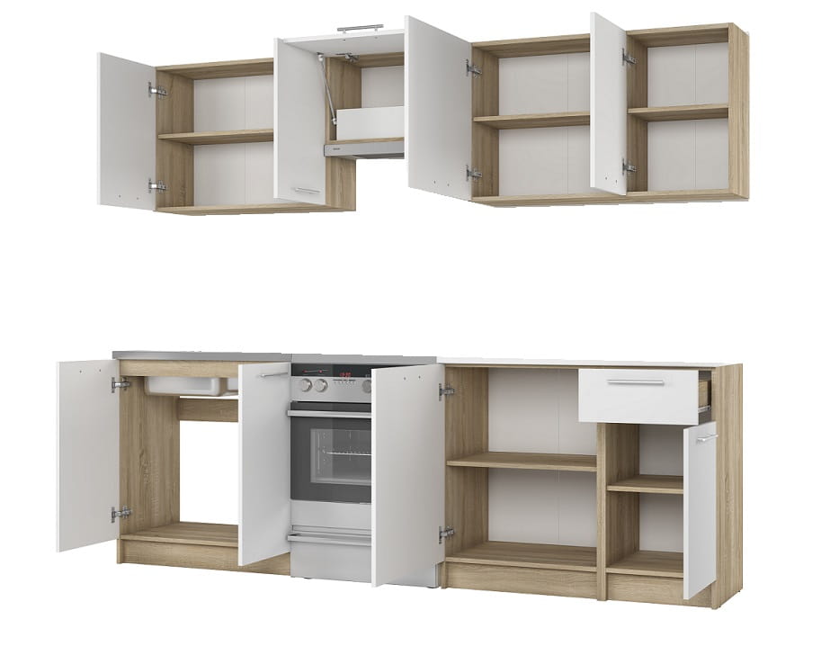Sercem zestawu Darton jest przemyślany system przechowywania. Cztery szafki wiszące, w tym specjalna szafka nad okap wyposażona w innowacyjne podnośniki gazowe, zapewniają komfortowy dostęp do przechowywanych produktów. Trzy szafki dolne, z dedykowanym miejscem na wpuszczany zlewozmywak, zostały zaprojektowane z dbałością o ergonomię codziennego użytkowania. Pojemna szuflada na sztućce oraz przestronne półki na talerze i garnki sprawiają, że wszystko znajduje się na wyciągnięcie ręki.