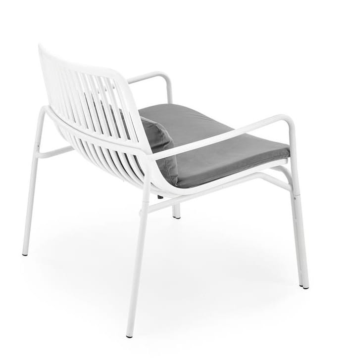 Głębokie siedzisko z wyprofilowanymi podłokietnikami wykonano z wytrzymałego polipropylenu w eleganckim, ponadczasowym kolorze białym. W celu zapewnienia dodatkowego komfortu, designerzy zaproponowali miękką poduszkę w stonowanym odcieniu koloru szarego. Fotel spoczywa na solidnym stelażu metalowym, który starannie pomalowano metodą proszkową, nadając konstrukcji trwałości i odporności na zmienne warunki atmosferyczne.