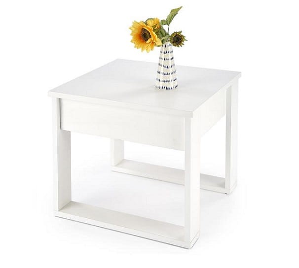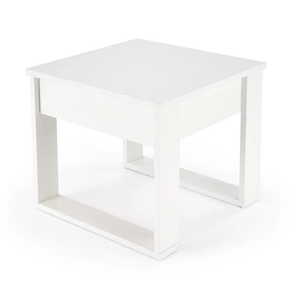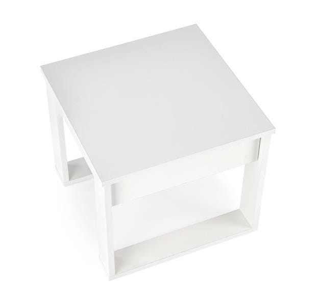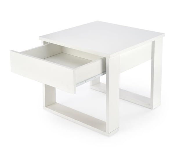 Stolik z szufladą wykonano z laminowanej płyty meblowej, a jego ponadczasowy deseń, w kolorze białym nadaje mu neutralnego, skandynawskiego wyglądu. To właśnie ten efekt sprawia, że ten kwadratowy stolik staje się urokliwym dodatkiem, który wprowadzi do wnętrza atmosferę przytulności i elegancji.