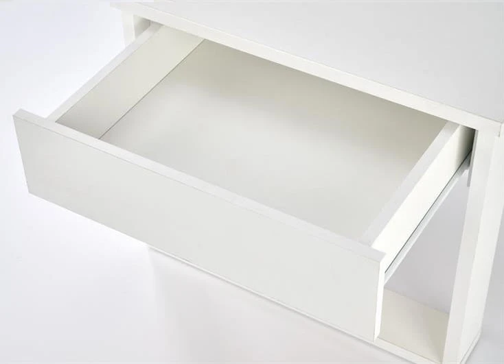 Kwadratowy blat tworzy płynne przedłużenie pionowych elementów, co dodaje konstrukcji subtelności i lekkości. Pod blatem znajduje się szuflada (interesujące rozwiązanie!), która idealnie wkomponowuje się w design mebla, zachowując jego minimalistyczną linię, a jednocześnie oferując praktyczne miejsce na przechowywanie drobnych przedmiotów.