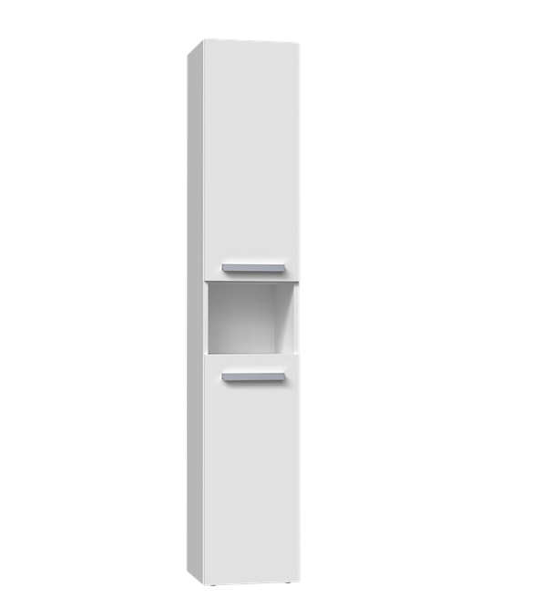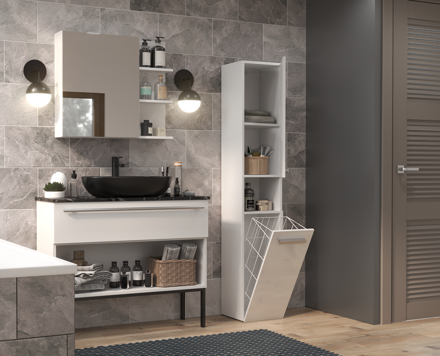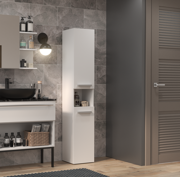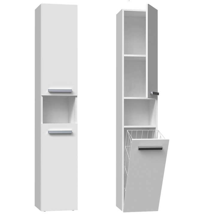 Aby utrzymać porządek w łazience, wymaga ona odpowiedniego zagospodarowania jeśli idzie o miejsce do przechowywania akcesoriów higienicznych i kosmetyków. Nasz minimalistyczny słupek łazienkowy, wyposażony w drzwi, otwartą półkę oraz pojemny kosz na pranie, to rozwiązanie, które pomoże w utrzymaniu harmonii w pomieszczeniu kąpielowym, nie zajmując przy tym zbyt wiele przestrzeni.