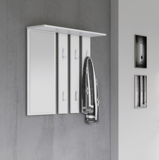 Biały wieszak z półką i lustrem do przedpokoju