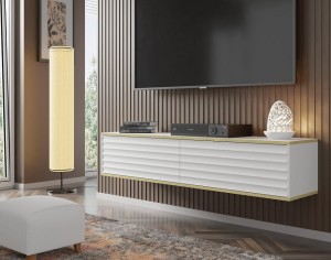Złote obramowanie wiszącego stolika pod TV nadaje mu unikalny wygląd, który przyciąga spojrzenia. Wykonana z wysokiej jakości MDF, ta szafka jest solidna i trwała, zapewniając nie tylko piękno, ale także funkcjonalność na lata.