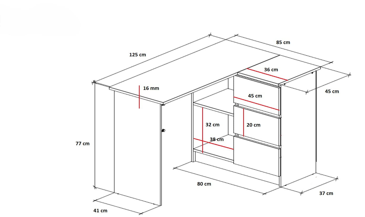Biurko narożne Geron zostało zaprojektowane z myślą o maksymalnej wygodzie i ergonomii. Dzięki trzem praktycznym szufladom i pojemnym półkom bez trudu uporządkujesz dokumenty, książki, zeszyty czy akcesoria szkolne – wszystko, co zazwyczaj zalega na blacie, teraz ma swoje miejsce. Wymiary 124x85x76 cm pozwalają dopasować biurko zarówno do mniejszych pokoi młodzieżowych, jak i kompaktowych przestrzeni biurowych w domu. Wykonane z trwałej płyty laminowanej, biurko nie tylko świetnie się prezentuje, ale także wytrzyma intensywne użytkowanie przez wiele lat. Dzięki narożnej konstrukcji łatwo wykorzystasz każdy centymetr dostępnej przestrzeni – niezależnie od tego, czy aranżujesz kąt do nauki, czy strefę pracy zdalnej.
