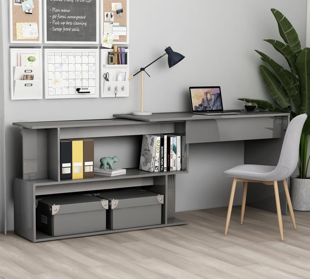 Piękne biurko narożne w szarym połysku to doskonała propozycja dla osób o wysokich oczekiwaniach co do mebla przeznaczonego do pracy umysłowej lub do nauki. Prezentowane biurko jest eleganckie, a zarazem funkcjonalne. Piękny design z pewnością uprzyjemni wykonywanie codziennych zadań kancelaryjnych oraz informatycznych.