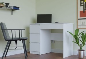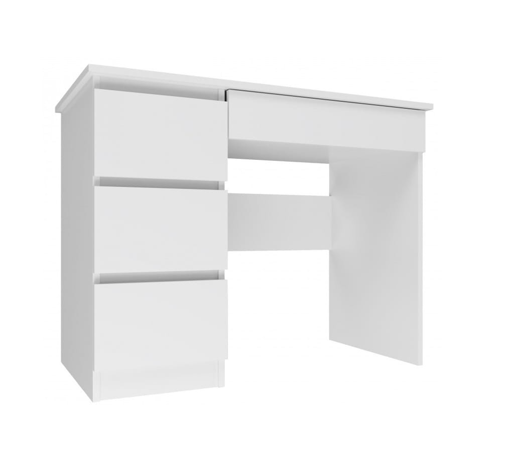 Białe biurko z płyty laminowanej, z szufladami - świetnie sprawdzi się pod komputer lub jako ergonomiczne, nowoczesne biurko na laptopa. Komfortowy blat mebla w kolorze białym to tylko jeden z jego istotnych elementów. Biurko wyposażone jest dodatkowo w wysuwane, pojemne szuflady na drobiazgi, gadżety, niezbędne do nauki lub pracy - akcesoria.