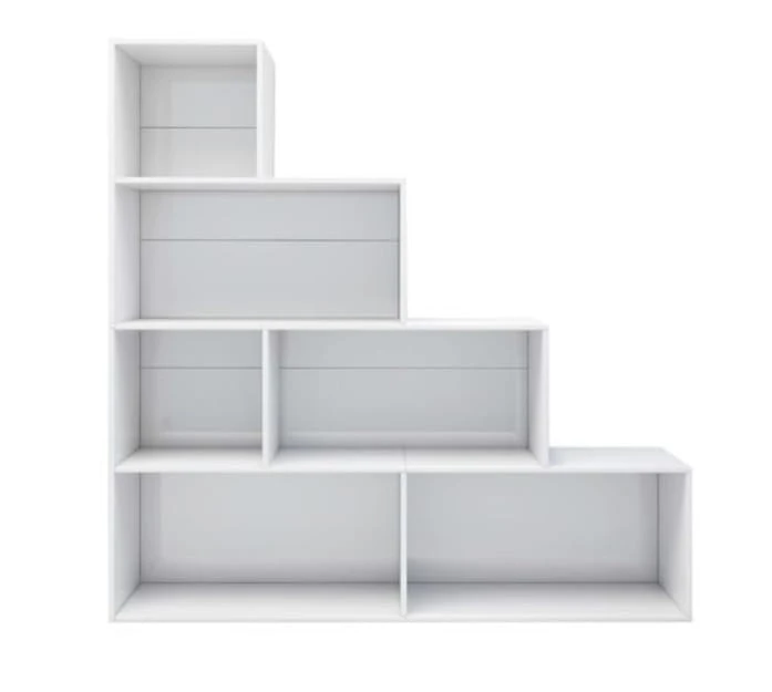Regał na książki Stativ ma prostą, a jednocześnie niezwykle ciekawą formę. Wykonany jest on z solidnej, a zarazem przystępnej cenowo płyty meblowej w kolorze biały połysk. Do dyspozycji użytkownika jest tutaj aż 6 otwartych, pojemnych półek, zaprojektowanych w interesujący sposób. Schodkowy regał jest i praktyczny i atrakcyjny wizualnie. To właśnie dzięki asymetrycznym komorom, służącym do przechowywania książek i nie tylko! Bo półki mogą oczywiście służyć również innym rzeczom. Swoje miejsce znajdą tutaj dokumenty, czasopisma, nośniki multimedialne, pamiątki i bibeloty. W zależności od potrzeb regał można wykorzystać na różne sposoby. Nawet do przedzielenia pokoju czy domowej biblioteki!