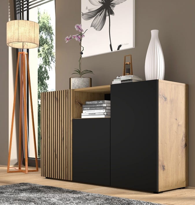 Komoda z lamelami to efekt nowoczesnej myśli designerskiej. Ma stonowaną kolorystkę. Połączono tu odcień naturalnego drewna w wybarwieniu dębu artisan z matową, głęboką czernią. Kropkę nad "i" stanowią ultra modne lamele, nadającego projektowi sznytu.