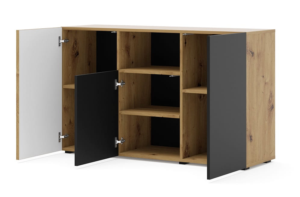 Komoda z lamelami Omel zrobiona jest z wysokiej jakości płyty MDF. Mebel ma 135 cm szerokości, dlatego warto mieć na uwadze, że może zdominować przestrzeń swoją postawnością. Jednocześnie, taki wymiar zapewnia naprawdę dużo miejsca do przechowywania, gdyż model komody Omel wyposażony jest w aż 7 półek! Jedna otwarta to miejsce na pamiątki, bibeloty czy podręczne drobiazgi. Sześć kolejnych półeczek gwarantuje bardzo dużo miejsca przeznaczonego na chowanie rzeczy. Dzięki zastosowanemu systemowi push and open jest to niezwykle łatwe. Wystarczy nacisnąć, by otworzyć jedną z trzech szafek, za drzwiczkami których ukryte są funkcjonalne półeczki. To nowoczesne rozwiązanie doceniane przez wymagających użytkowników.