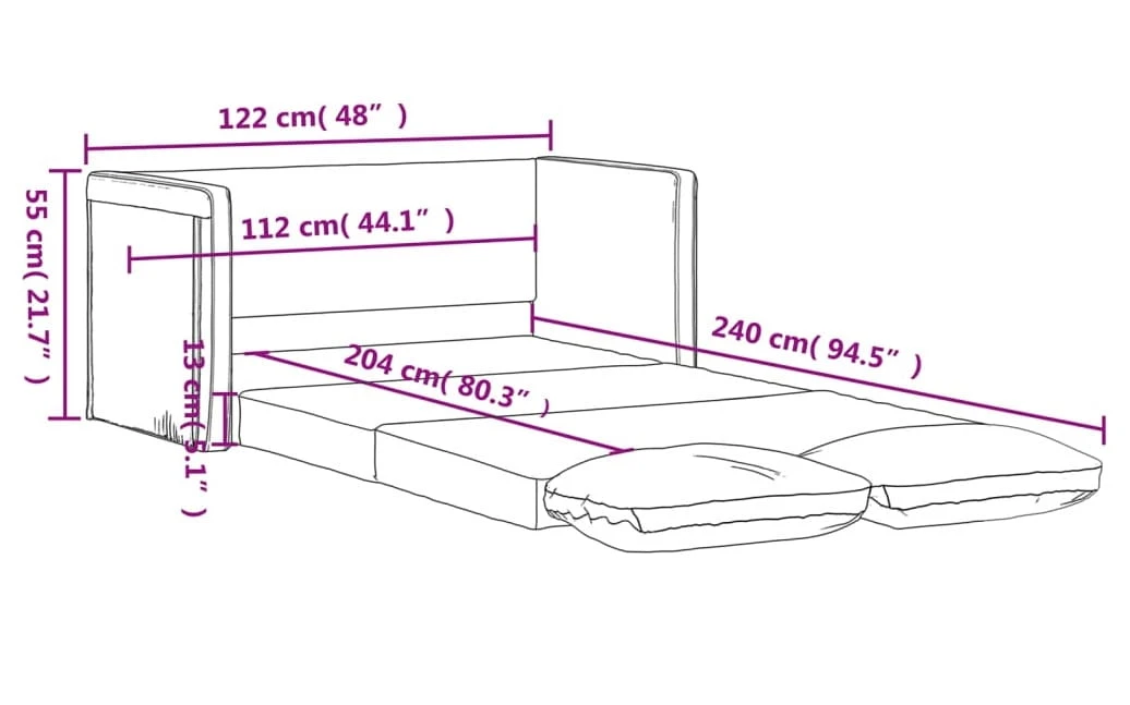 - Łóżko (po rozłożeniu): szerokość - 122 cm, długość - 204 cm 55 cm