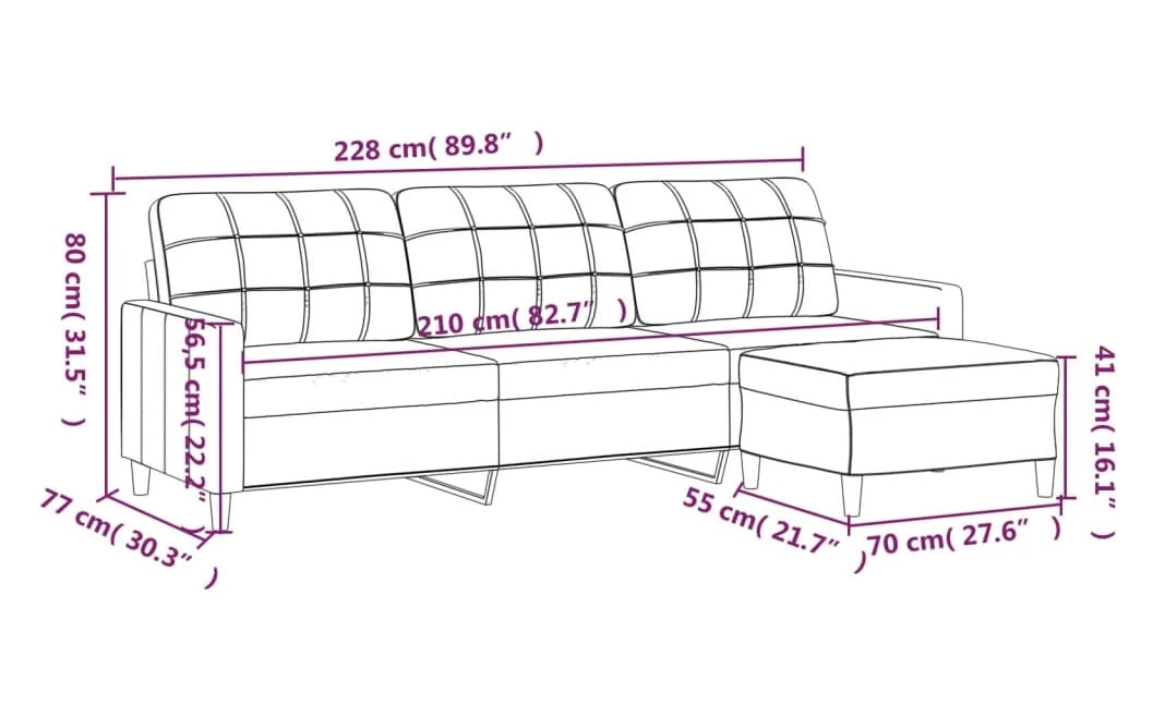 - Wymiary: sofa - szerokość - 228 cm, głębokość - 77 cm, wysokość - 80 cm, szerokość siedziska - 210 cm, głębokość siedziska - 50 cm, wysokość siedziska nad ziemią - 41 cm, wysokość podłokietników nad ziemią - 56,5 cm; podnóżek - szerokość 70 cm, głębokość - 55 cm, wysokość - 41 cm