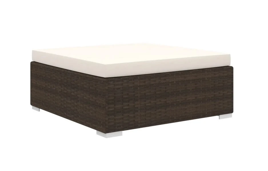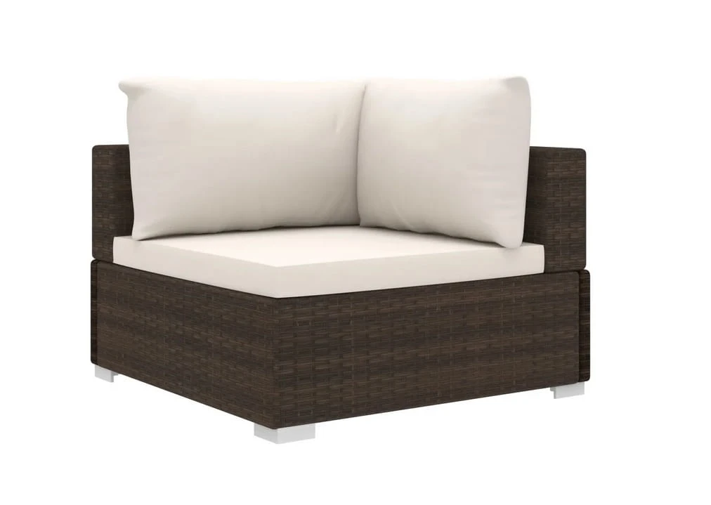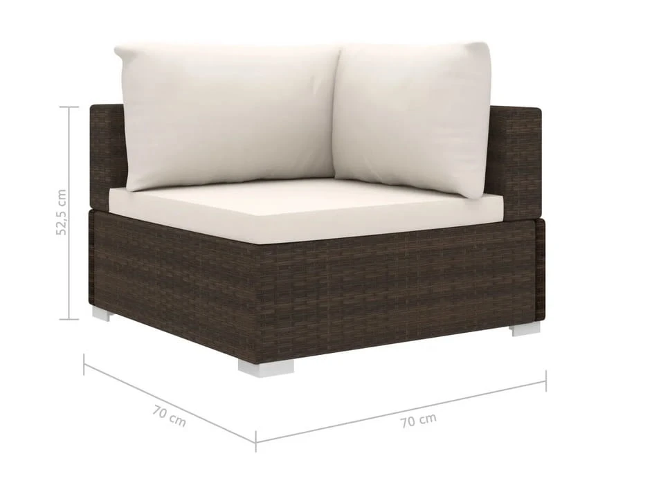 Ogrodowy zestaw wypoczynkowy Karli w kolorze brązowym pozwoli cieszyć się urodą każdego dnia spędzonego na świeżym powietrzu. Jest stabilny, komfortowy, pełen klasy. Składa się z pięciu części. W komplecie tym znajduje sofa, podnóżek, a także funkcjonalny stolik kawowy. Całość dopełniają grube poduszki na siedziska i oparcia w stylowym, kremowym odcieniu. Miękkie elementy zabezpieczone są pokrowcami, które w łatwy sposób można zdjąć i wyprać. Konstrukcję wystarczy przetrzeć wilgotną ściereczką, by nabrała blasku. Cały polirattanowy zestaw do ogrodu łatwo jest utrzymać w czystości. Ponadto nie poddaje się on działaniu wilgoci oraz słońca i nie płowieje. Dzięki temu posłuży przez wiele fantastycznych sezonów.