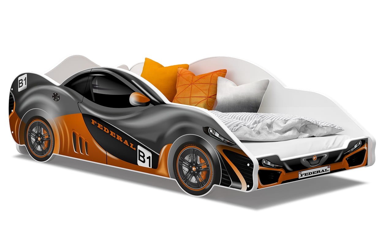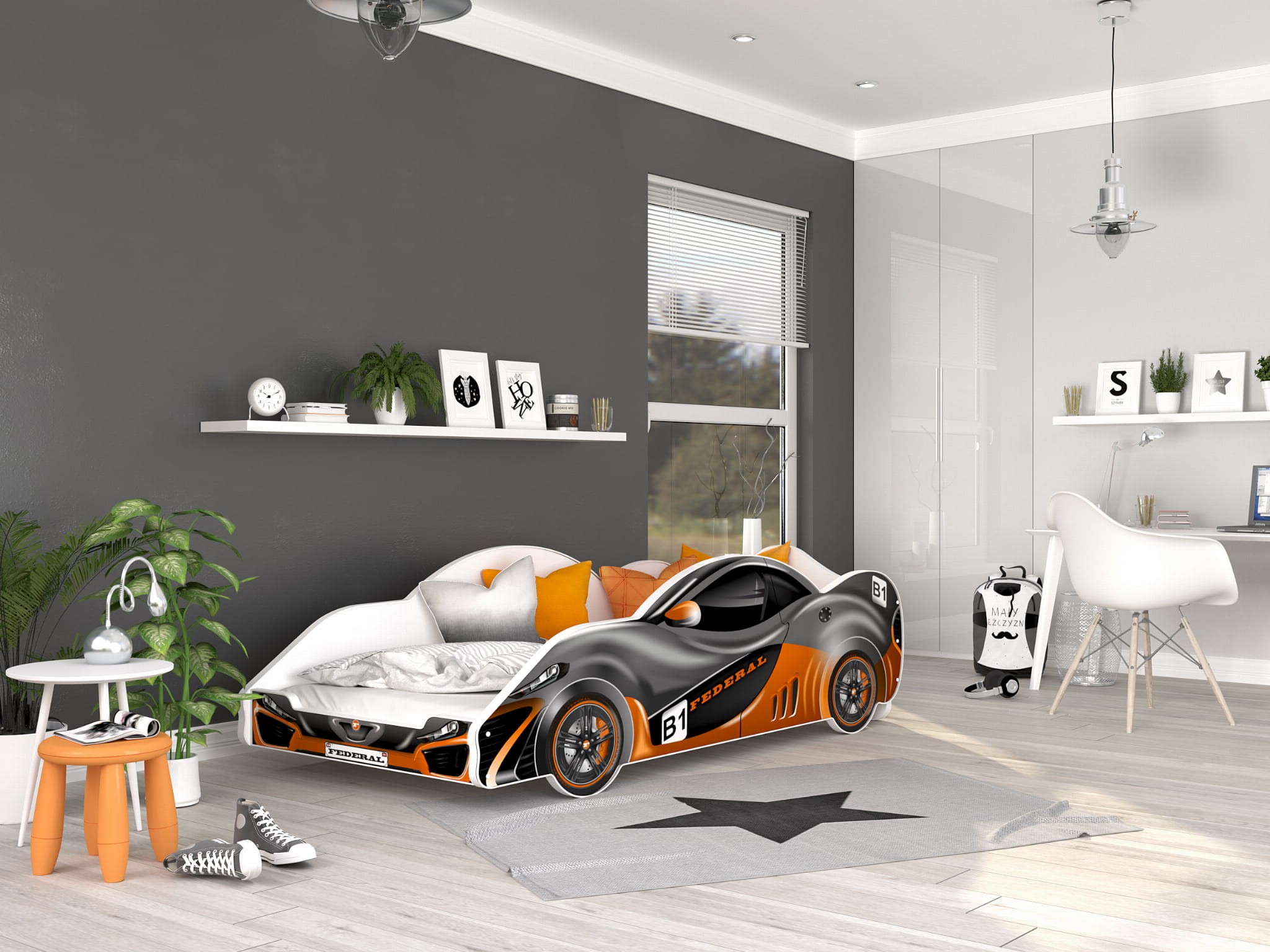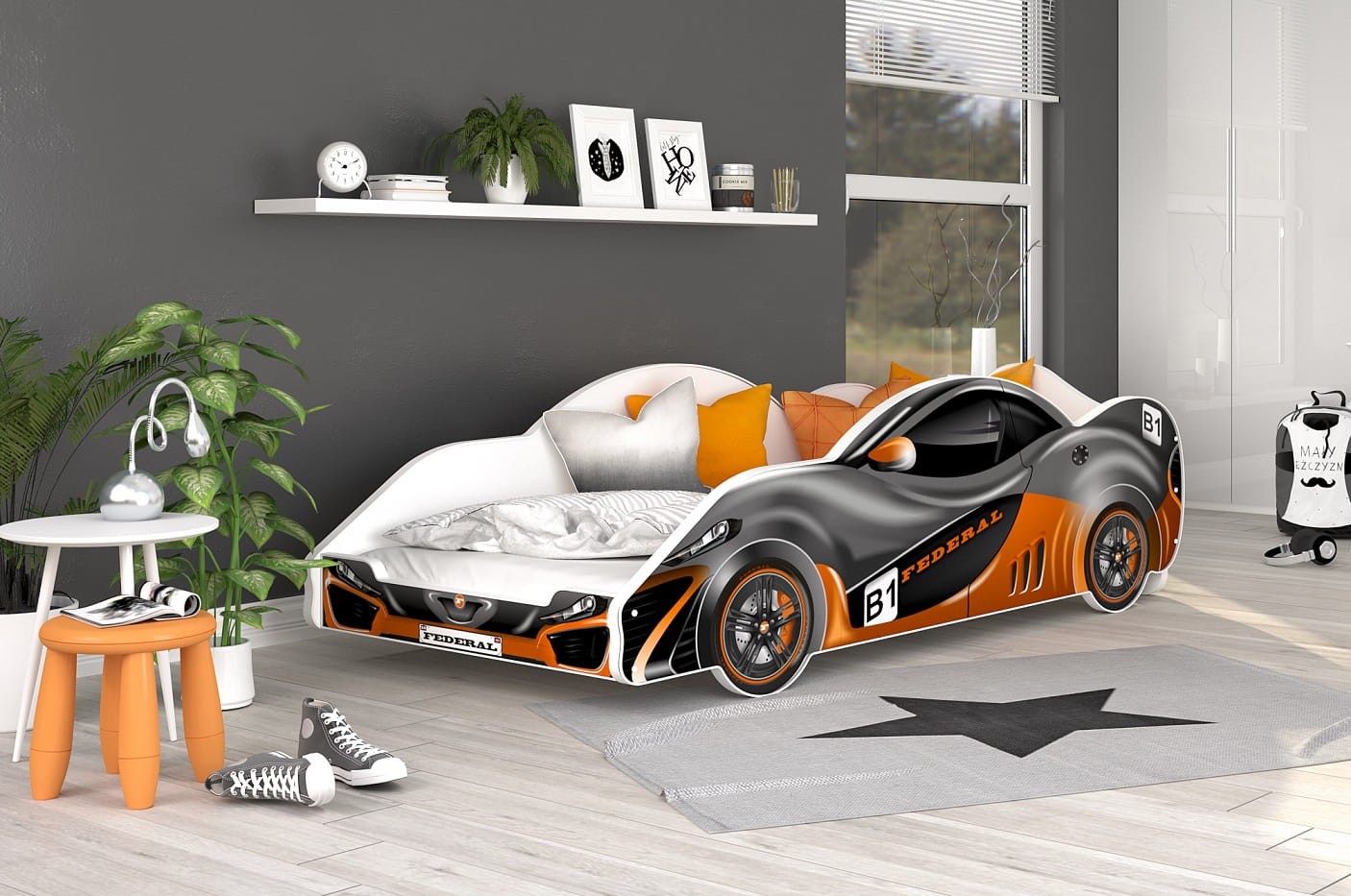 Jednoosobowe łóżko dziecięce samochód wyścigowy odznacza się wyglądem, wygodą i co istotne - solidnym wykonaniem. Zrobione z laminowanej płyty meblowej, zabezpieczone jest z brzegu miękką, plastikową okleiną. Łóżko wyposażyliśmy w stelaż flex, a także w komfortowy materac piankowy o twardości H3. Pomimo, iż wygląda jak pojazd dla małego kierowcy - łóżko zaprojektowano przede wszystkim z myślą o komfortowym wypoczynku dziecka. Ma klasyczny szkielet, a specjalnego wizerunku nadaje mu zdobienie ramy.