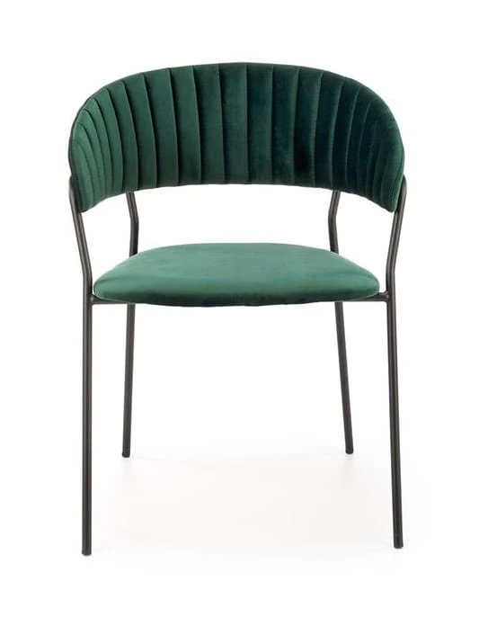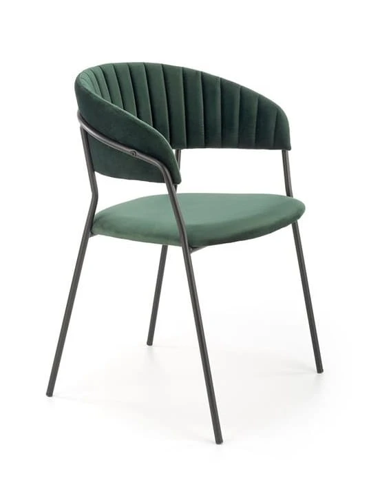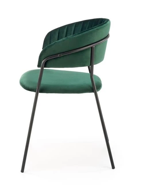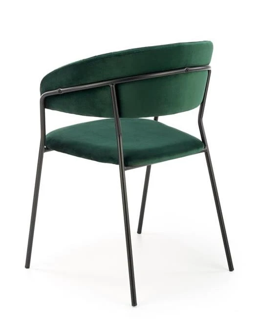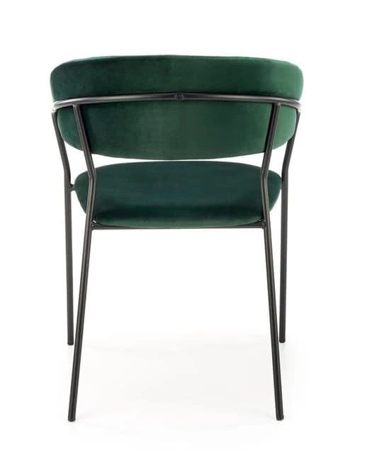 Konstrukcja tego modelu jest dość minimalistyczna, ale siedzisku nie brakuje charakteru. Proste nóżki stalowe i element oparcia (prezentujący się interesująco!) wykonane są ze stali malowanej proszkowo w czarnym kolorze, nadającym temu meblowi pewnego blichtru. Jest on jednak skutecznie zrównoważony elementami miękkimi, tapicerowanymi. Komfortowe siedzisko wykonane jest z eleganckiej tkaniny velvet w kolorze ciemnozielonym. Podobnie jak wygodne, zaokrąglone oparcie. Tutaj jednak designerzy odważyli się na interesujące dodatki. Przebiegające w pionie zaokrągleń przeszycia sprawiły, że krzesło Jacob wygląda jeszcze korzystniej.