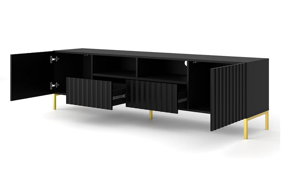 Niska szafka pod telewizor Golden Waler nie tylko zachwyca designem, ale także cechuje się solidną konstrukcją i trwałością. Korpus z płyty laminowanej o grubości 16 mm oraz frezowane fronty z płyty MDF gwarantują wytrzymałość na długie lata. Dodatkowo, eleganckie metalowe nóżki w złotym odcieniu podkreślają wyjątkowy charakter mebla i zapewniają stabilność.
