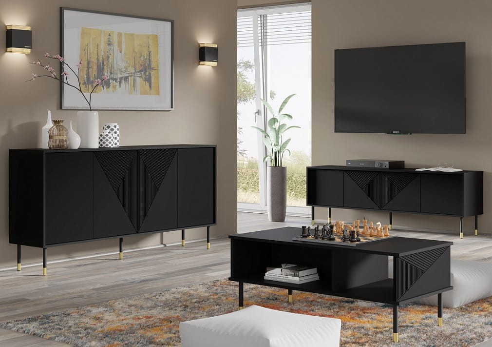 Stylowa szafka RTV Gianni zachwyca nie tylko swoim designerskim wyglądem, ale również funkcjonalnością. Jej czarne fronty z subtelnymi ryflowaniami dodają meblowi wyjątkowego charakteru, podczas gdy złote końcówki nóżek nadają mu luksusowego wykończenia.