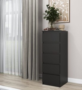 Nowoczesna komoda z serii Nebra w kolorze czarnym to funkcjonalny i pakowny mebel, który urządzi wnętrze Twojej sypialni, salonu lub pokoju dziecka. Uniwersalny i minimalistyczny wygląd sprosta oczekiwaniom wszystkich, którzy cenią połączenie prostoty i elegancji. Komoda posiada aż pięć pojemnych szuflad, w których pomieszczą się nie tylko ubrania, ale także wiele innych przydatnych drobiazgów. Komoda dzięki swojej stonowanej kolorystyce i prostej formie doskonale wkomponuje się zarówno we wnętrza urządzone w stylu skandynawskim, minimalistycznym jak i nowoczesnym. Pięć pojemnych szuflad zapewnia praktyczne i komfortowe przechowywanie. Nasza komoda Nebra świetnie nadaje się także do pokoi dziecięcych i młodzieżowych.