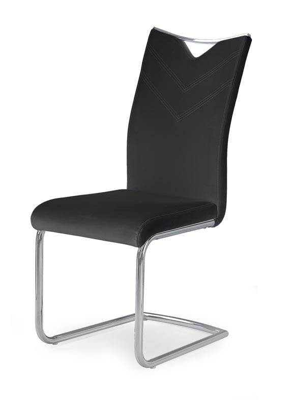 Pięknie zaprojektowane siedzisko, z subtelnymi, geometrycznymi przeszyciami na oparciu, a także jego pomysłowe wykończenie u szczytu sprawiają, że tapicerowane krzesło cechuje się także elegancką formą! Metalowy uchwyt w górnej części oparcia pozwala na łatwe przenoszenie czy też przesuwanie mebla. W dodatku krzesło pokryte jest oddychającą, łatwą w czyszczeniu ekoskórą w kolorze czarnym. Odcień ten sprawi, że pomieszczenie wyposażone w krzesła na płozach Haga będzie stylowo urządzone.
