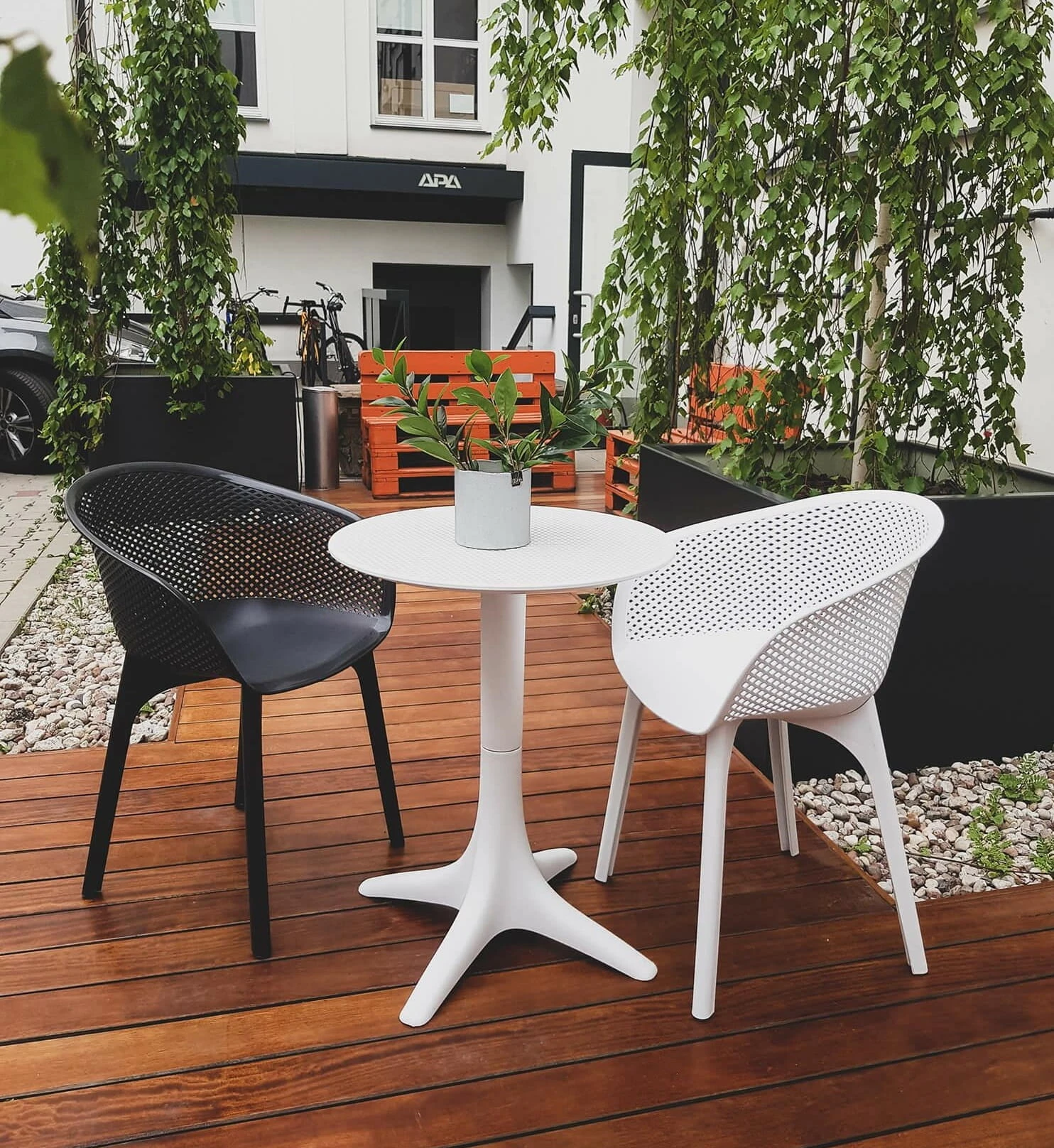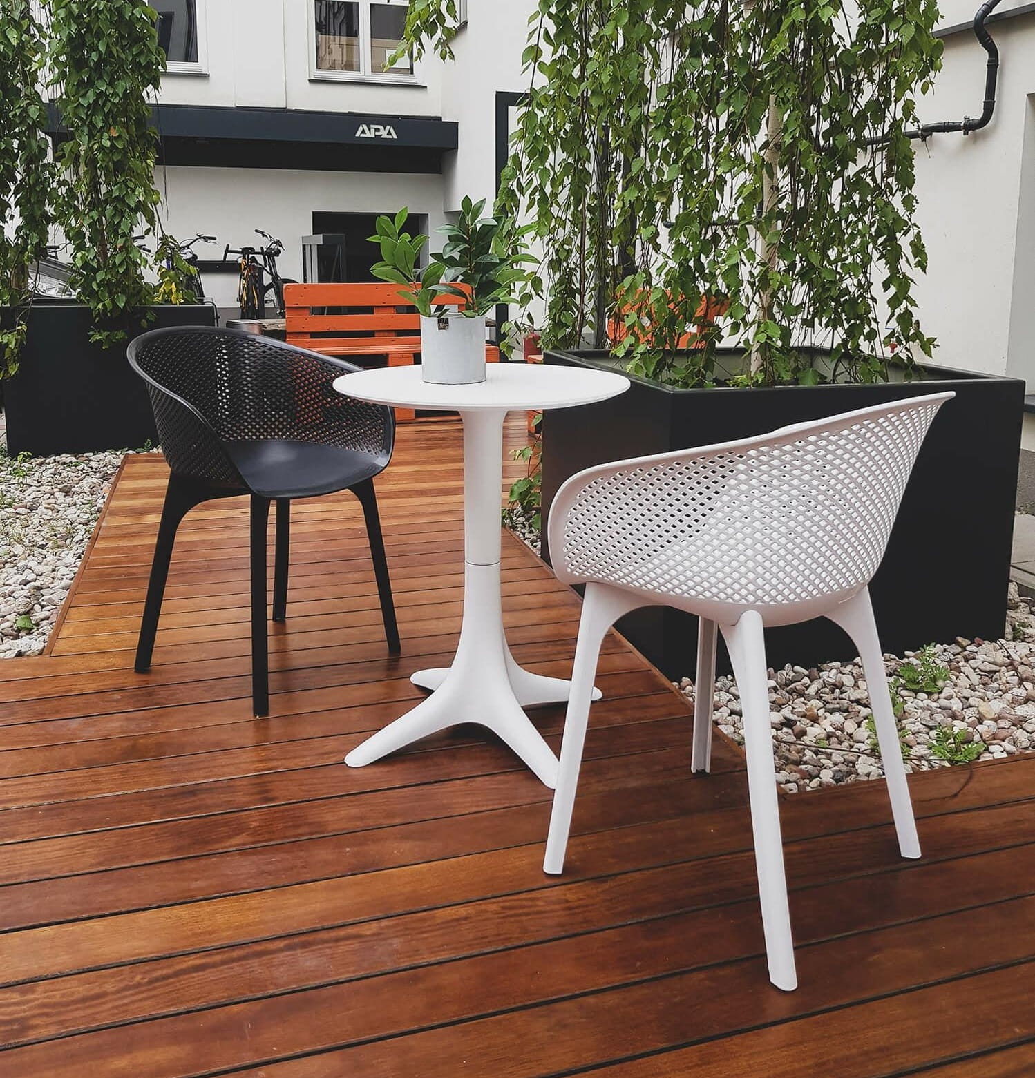 Jednak Rufus potrafi zaskoczyć. Siedzisko z oparciem stanowi jeden element, wyprofilowane jest w myśl kreatywnego designu, z zarazem wygodne. Ale to nie wszystko! Nasze krzesło, oprócz tego, że ma świetny kształt, zapewnia również przepływ powietrza i wody. Zaprojektowana, gęsta, ażurowa siatka z tworzywa sprawia, że model ten idealnie nada się do użytkowania na zewnątrz, bez potrzeby szczególnej pielęgnacji mebla. Jest przystosowany do zmieniających się warunków atmosferycznych i odporny na nie.