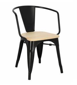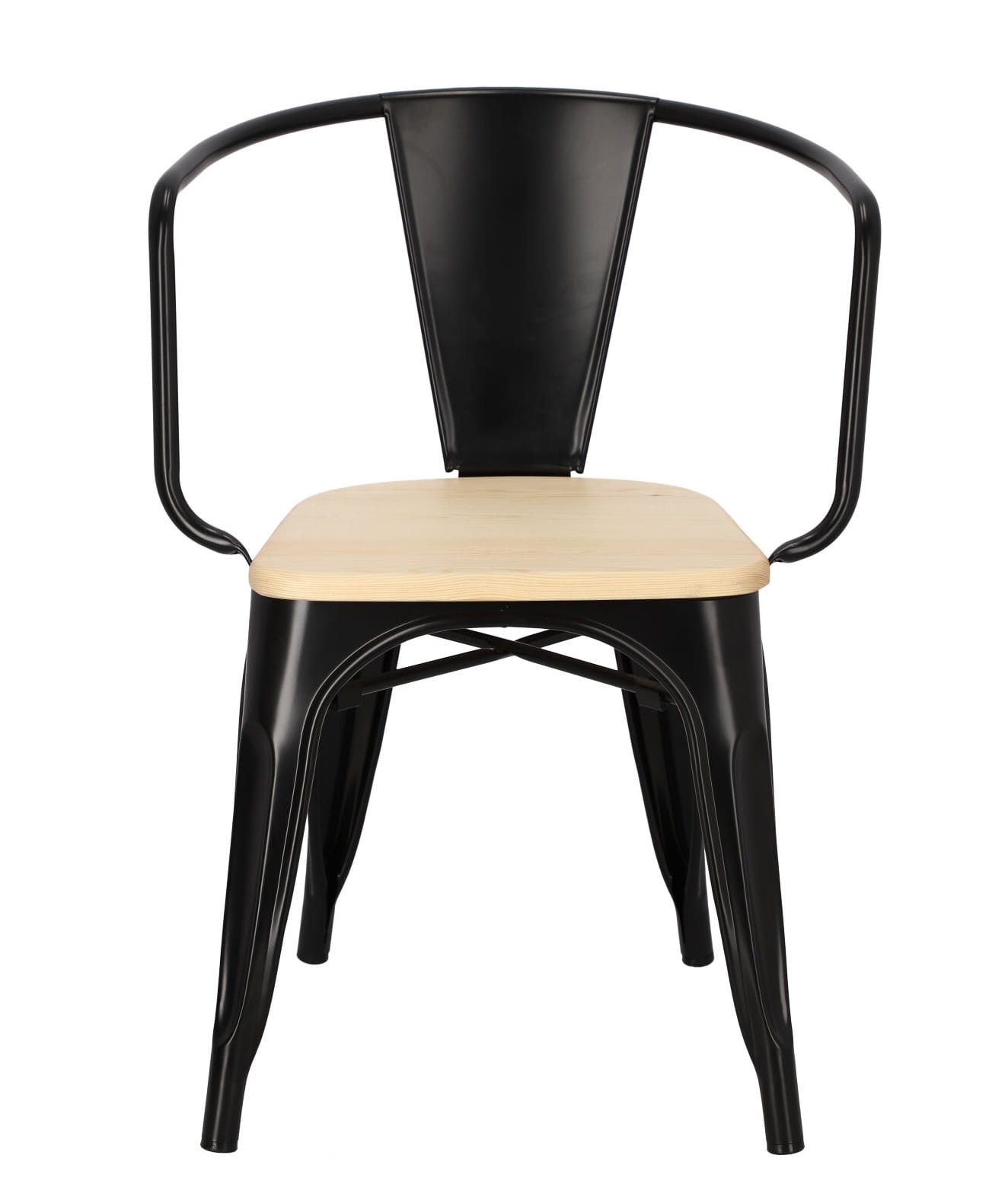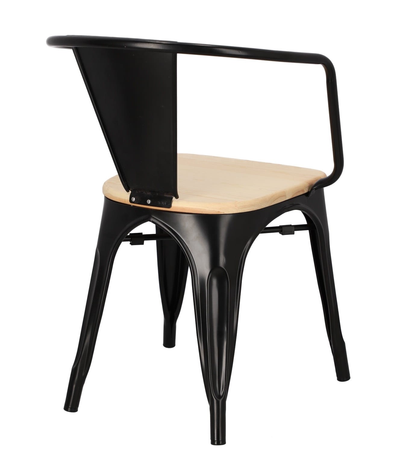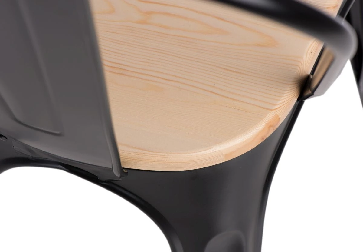 Czarne metalowe krzesło z drewnianym siedziskiem