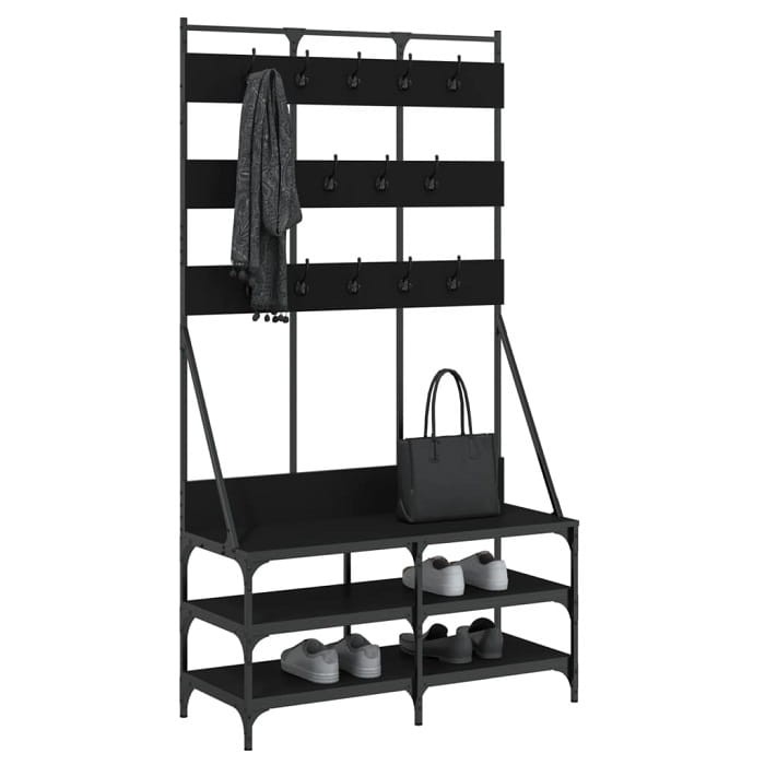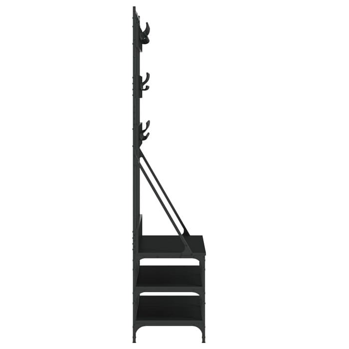 Wieszak do korytarza Jando to kwintesencja nowoczesnego stylu loftowego, gdzie czerń metalu harmonijnie współgra z czernią elementów płytowych, tworząc spójną, monochromatyczną kompozycję. Ten przemyślany mebel to nie tylko praktyczny wieszak na kurtki, ale również kompleksowe rozwiązanie organizacyjne dla Twojego przedpokoju.