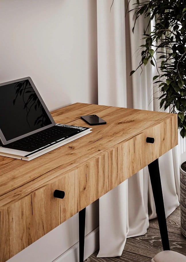 Ponadto, dbając o najwyższą jakość, nasze stylowe biurko wykonano z trwałych materiałów. Płyta meblowa o grubości 18 mm gwarantuje nie tylko solidną konstrukcję, ale także długotrwałą wytrzymałość. Okleina PCV 0.8 mm na kantach zapewnia odporność na ewentualne uszkodzenia, co pozwoli zachować piękny wygląd tego unikatowego biurka na wiele lat.