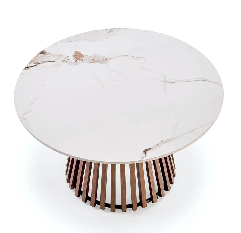 Okrągła ława kawowa z blatem w kolorze marmuru i lamelową podstawą