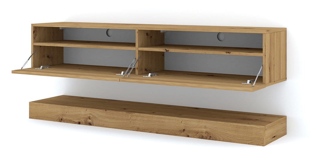 Szafka wisząca wyposażona jest w dwa zamykane schowki (otwierane do dołu), przeznaczone do przechowywania. Znajdują się tutaj również dwie otwarte półki. Te doskonale sprawdzą się jako miejsce do ustawienia sprzętów. W zestawie znajduje się zestaw oświetlenia LED, dzięki któremu szafka nabiera ekstrawagancji. Z kolei panel, korespondujący designem z pierwszym elementem prezentuje się nowocześnie i może służyć jako przestrzeń na książki, płyty, ale też na ramki ze zdjęciami czy pamiątki. Ten interesujący zestaw mebli RTV to propozycja dla wymagających! Polecamy!