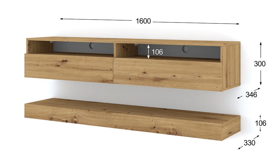 - Wymiary: szerokość - 160 cm, głębokość elementu wiszącego - 34,6, wysokość elementu wiszącego - 30 cm, głębokość panela - 33 cm, wysokość panela - 10,6 cm, wysokość otwartej półki - 10,6 cm