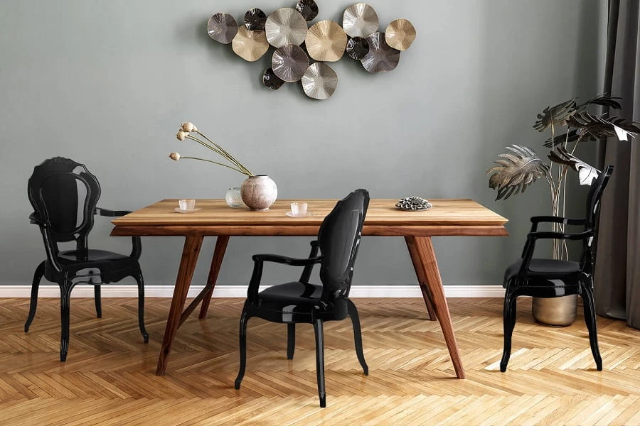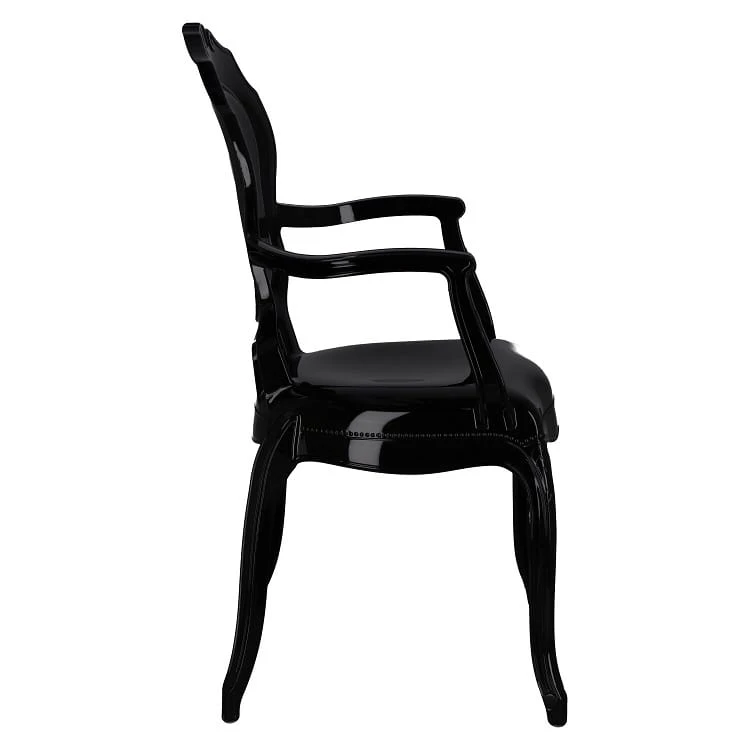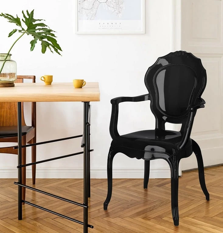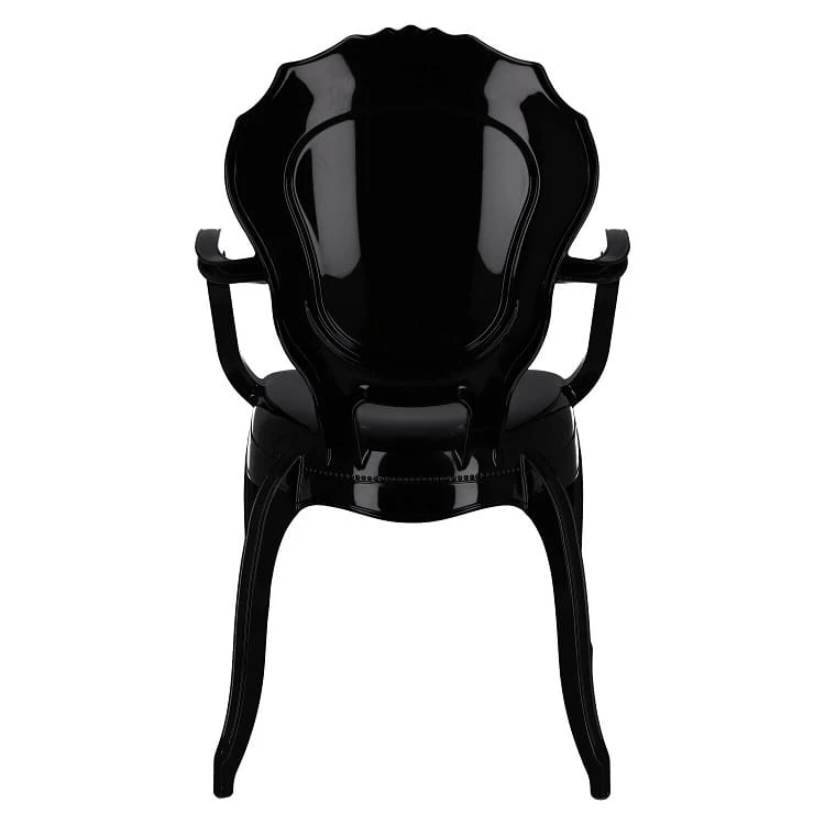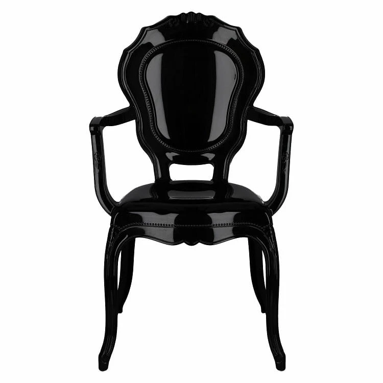 Jednak krzesło Rocco wspaniale wpisuje się we współczesne trendy, wśród których jednym z wiodących nurtów jest modern glam. Idealnie pokrywa się on z założeniami ludwikowskimi, tyle, że cechuje go zupełnie nowa forma. O tej nowoczesności świadczy przede wszystkim materiał, z jakiego krzesło glamour jest wykonane. To czarne, lśniące tworzywo, które imponuje charakterem.