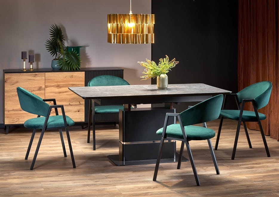 Model ten opiera się na starannie przemyślanych, smukłych, metalowych nogach - pomalowanych na kolor czarny, odpornych na uszkodzenia mechaniczne i korozję. Ta ciekawa, stabilna konstrukcja zapewnia jednocześnie wygodne podparcie w postaci podłokietników. Dzięki temu krzesło jest wygodne. Na Państwa uwagę zasługuje również siedzisko! Niebanalnie zaprojektowane, z komfortowym oparciem - jest tapicerowane są ultra modną tkaniną w kolorze zielonym. Takie połączenie materiałów, a także solidne wykonanie - gwarantują trwałość mebla oraz długiego użytkowania! Ponadto łatwo jest utrzymać takie krzesła w czystości. Świetnie wyglądają w zestawie! Taki komplet krzeseł prezentuje się oszałamiająco!