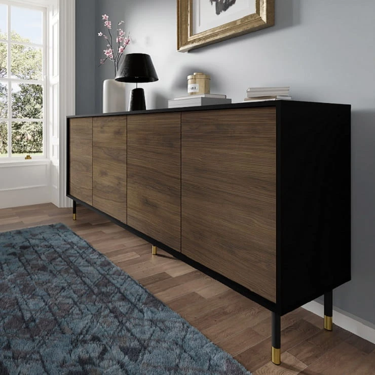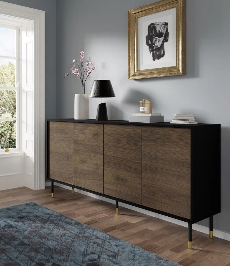 Podobnie jak w przypadku szafki RTV, kolorystyka komody z czarnym matowym korpusem oraz frezowanymi frontami w głębokim odcieniu dębu catania nada wnętrzu niepowtarzalnego charakteru i elegancji. Model ten świetnie sprawdzi się w ekskluzywnym salonie czy stylowej sypialni.
