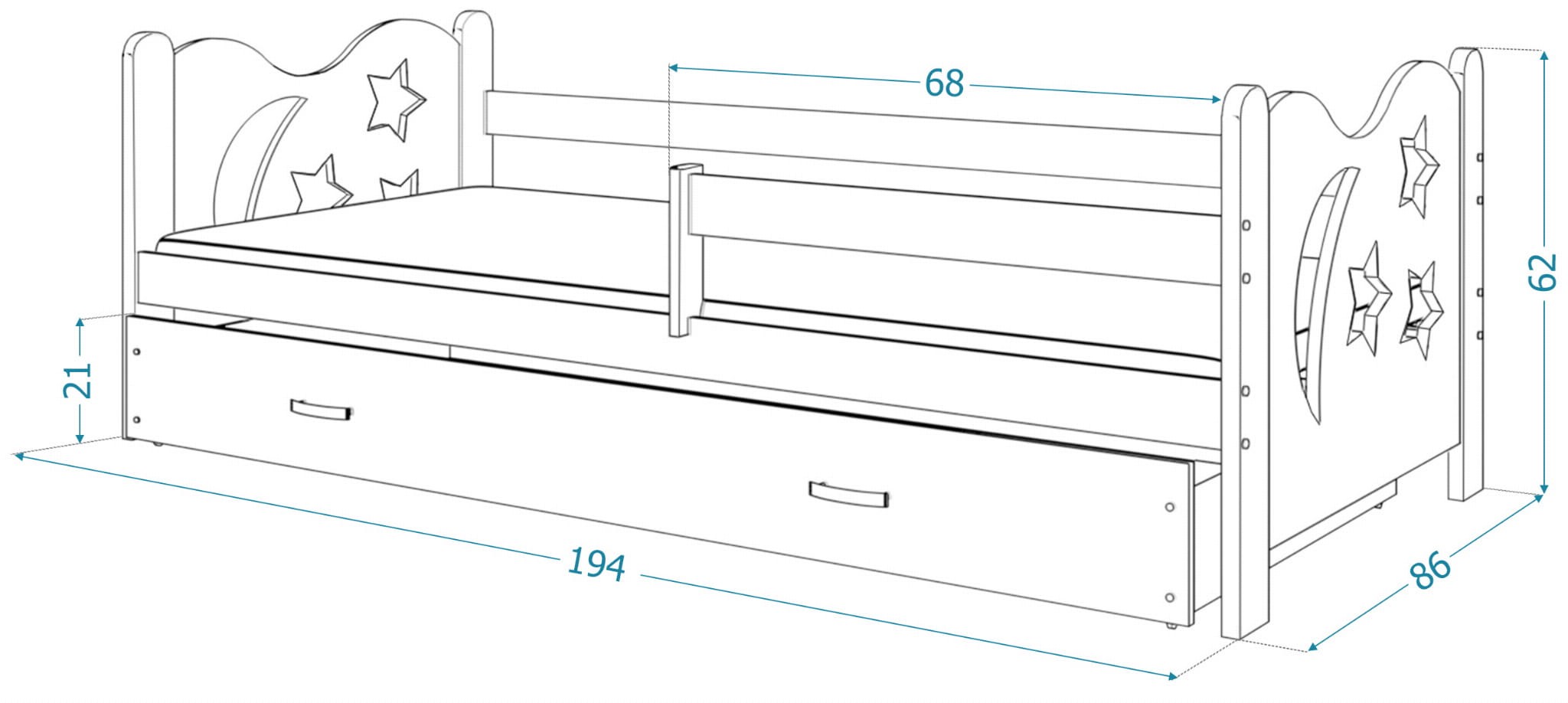 - Łóżko zawiera pojemną i wysuwaną szufladę na kółkach, bezpieczną barierkę oraz materac piankowy 80x190 cm
