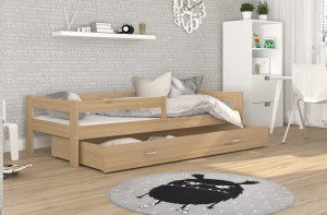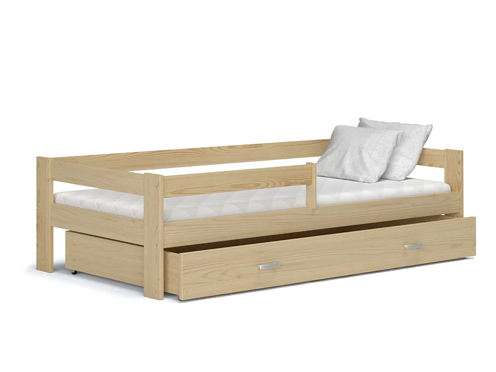 Drewniane łóżko dziecięce z barierką i szufladą sosna
