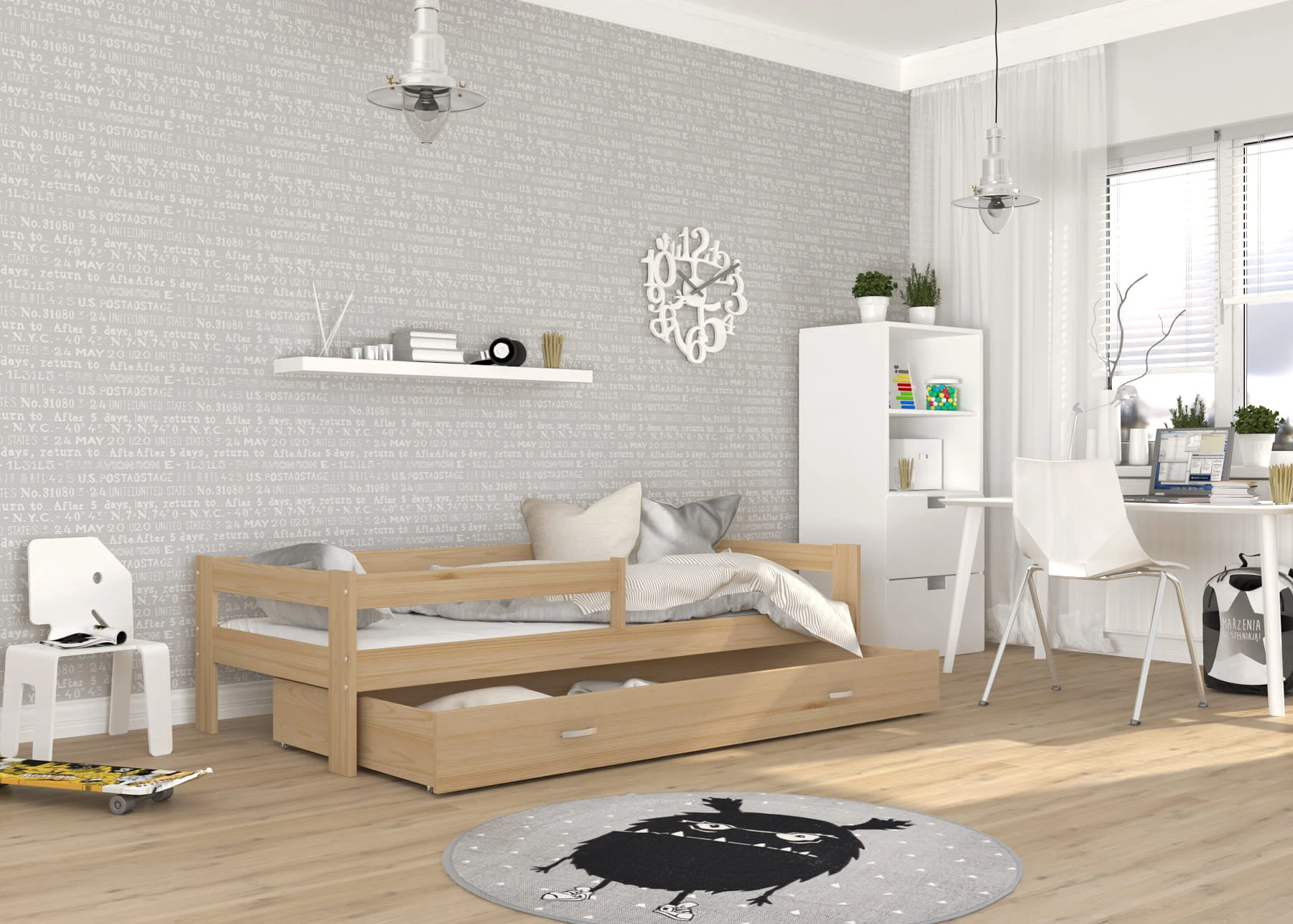 Łóżko dziecięce wyposażone w wysuwaną i pojemną szufladę na kółkach daje możliwość przechowywania pościeli i akcesoriów do spania jak np. koce, poduszki, zabawki. To istotne, szczególnie, ze dzieci traktują łóżka nie tylko jako miejsce wypoczynku, ale i przestrzeń do zabawy. Jakość wykonania, funkcjonalność i wzornictwo świetnie ze sobą współgrają.