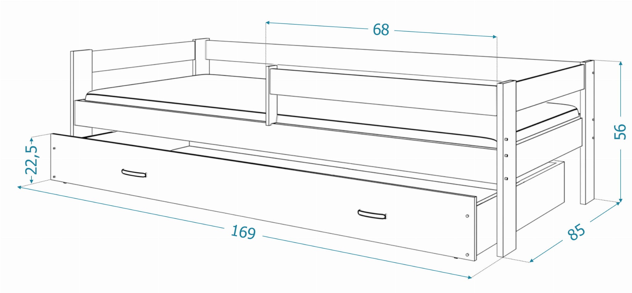 - Łóżko zawiera pojemną i wysuwaną szufladę na kółkach, bezpieczną barierkę oraz materac piankowy 80x160 cm