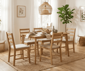 Poszukujesz praktycznego zestawu do kuchni lub jadalni? Przedstawiamy drewniany zestaw do kuchni i jadalni Corsa. Wyjątkowo praktyczny stół w komplecie z 4 krzesłami, który sprawdzi się w wielu pomieszczeniach, wykonany został z litego drewna kauczukowego. Może być doskonałym rozwiązaniem do przestronnej i komfortowej jadalni, kuchni czy nawet restauracji. Optymalne rozmiary pozwolą na przyjemne i wygodne spożywanie posiłków w towarzystwie bliskich osób. Uniwersalny wygląd stołu pozwala na łączenie go z innymi meblami i tworzenie niepowtarzalnych oraz wyjątkowych kompozycji. Stabilna konstrukcja gwarantuje długoletnie użytkowanie. Stół ten będzie się pięknie prezentował we wnętrzach nowoczesnych, które zdecydowanie ociepli i rozjaśni.