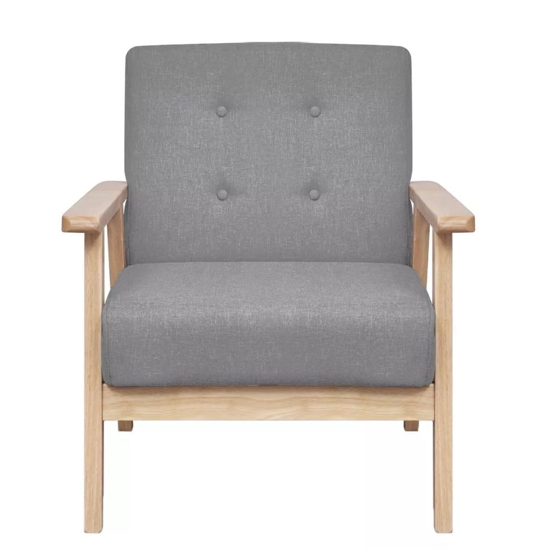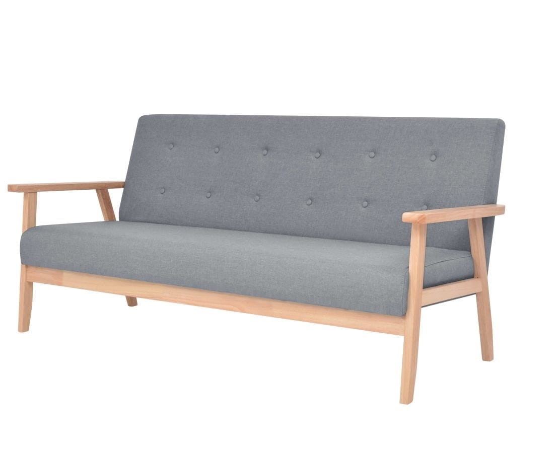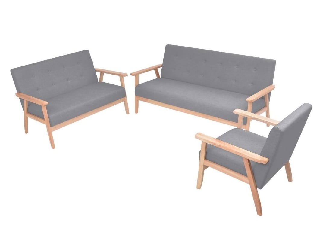 Zestaw wypoczynkowy Vintage, choć prosty i minimalistyczny - to jest niezwykle oryginalny. Składa się z fantastycznego fotela i dwóch sof różnych rozmiarów. Jedna z nich jest dwuosobowa, druga - trzyosobowa. Komplet świetnie sprawdzi się w otoczeniu innych mebli retro o bogatej historii, a także zielonych roślin doniczkowych podbijających Instagram i makram na ścianach. Tym bardziej, że konstrukcje sof i fotela wykonane są z solidnego drewna w naturalnym kolorze. Szare tapicerowanie, a także interesujące pikowania nadają całemu wypoczynkowi niebanalnej estetyki.
