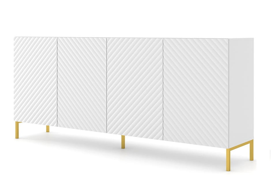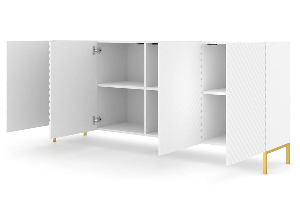 Zgrabna bryła komody wyposażona jest w cztery pojemne szafki z półkami, co sprawia, że stanowi idealną przestrzeń do przechowywania różnego rodzaju przedmiotów, od ubrań po dokumenty. Komoda zachwyca swoim unikalnym wyglądem dzięki frezowaniom, które zdobią fronty szafek.