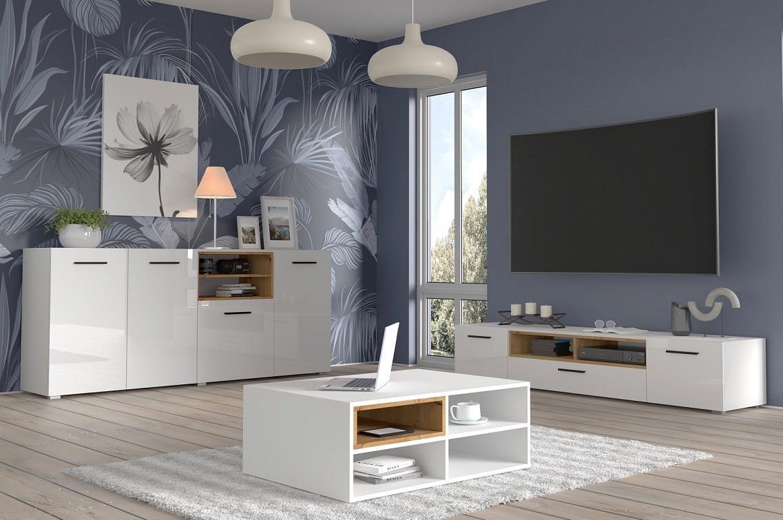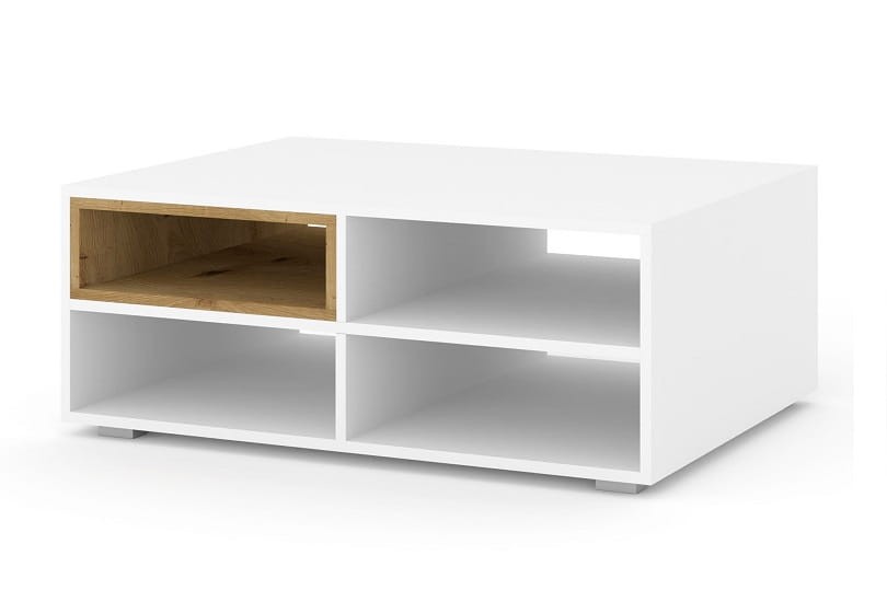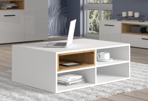 Ławę kawową z serii Blanc White można postawić w każdej części salonu, co czyni ją meblem uniwersalnym o wszechstronnym zastosowaniu. Świetnie nadaje się jako stolik podręczny, przydatny w czasie wypoczynku, gdy oglądamy telewizję i chcielibyśmy mieć w zasięgu ręki miejsce do odłożenia pilota czy postawienia naczynia z napojem, a także do serwowanie kawy czy herbaty w celu ugoszczenia najbliższych i odwiedzających nas znajomych. Połączenie zawsze modnego drewna z elementami w kolorze białym nadaje meblowi elegancki wymiar, a kącik wypoczynkowy staje się dzięki niemu przytulny i przyjazny.